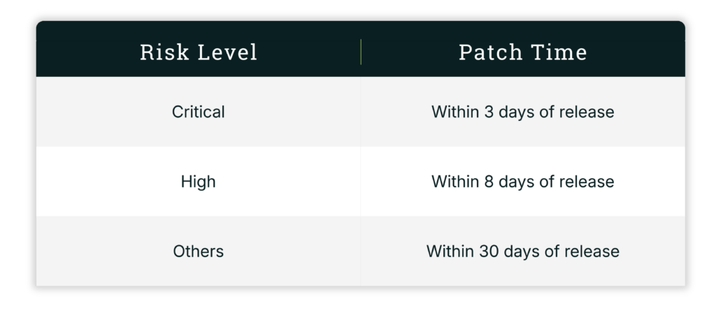 Many organizations calculate patch timelines on business days, but vulnerabilities don’t pause weekends or holidays. Treating patch deadlines as calendar days ensures that systems remain protected continuously, without gaps over off days. This approach allows security teams to respond immediately to newly disclosed vulnerabilities and reduces the window of opportunity for attackers. In today’s fast-moving threat landscape, every hour counts, making calendar-day timelines a practical and essential strategy for minimizing risk.